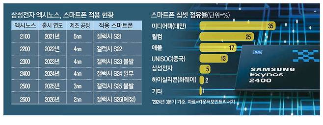 엑시노스 칩은 갤럭시 스마트폰에 탑재됐다가 제외되기를 반복해왔다. 갤럭시 S23 시리즈에는 엑시노스 2300이 탑재되지 않았고, 갤럭시 S25 시리즈에서도 엑시노스 2500 적용이 무산됐다. 반면 갤럭시 S24 시리즈에는 일부 모델에 엑시노스 2400이 탑재됐다.