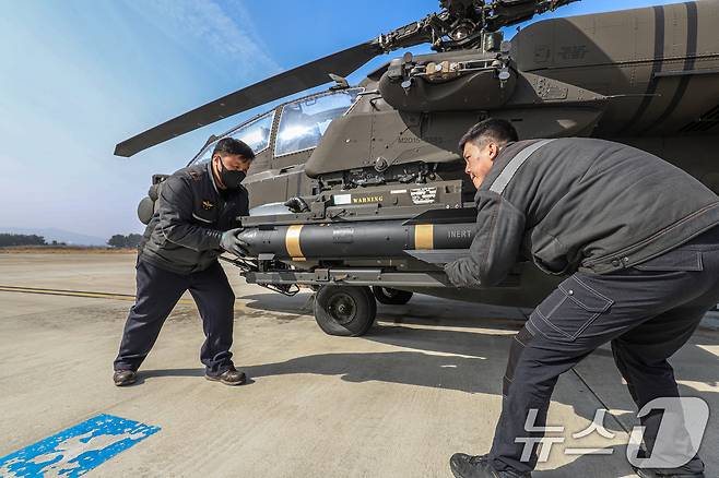 사진은 육군항공사령부 소속 무장사들이 아파치에 훈련용 헬파이어 미사일을 무장하고 있는 모습. (육군 제공. 재판매 및 DB 금지) 2025.3.13/뉴스1