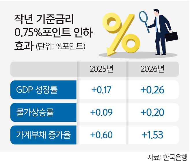 지난해부터 이뤄진 세 차례 기준금리 인하가 올해 국내총생산(GDP) 성장률을 끌어올릴 것이라는 분석이 나왔다. 한국은행은 물가·가계부채 흐름은 아직 안정적이라며 추가적인 기준금리 인하 가능성도 열어뒀다.