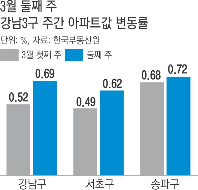 한국부동산원이 13일 발표한 ‘3월 둘째주(10일 기준) 전국 주간 아파트가 동향’에 따르면 이번주 서울 아파트 매매가격은 전주 대비 0.2% 상승했다. 강남 3구의 급등세가 서울 전체의 집값 상승을 견인하는 모양새다.