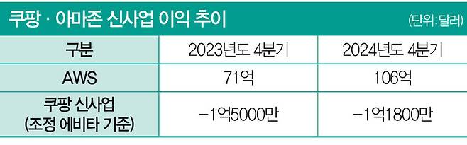 반면 쿠팡은 본업뿐 아니라 신사업도 저(底)마진 구조다. 지난해 4분기만 놓고 보면 신사업은 적자다. 쿠팡은 아마존과 달리 실적 설명자료에서 사업부별 영업이익은 공개하지 않는다. 조정 에비타만 확인이 가능하다. 지난해 4분기 쿠팡 신사업 부문 조정 에비타는 마이너스(-) 1억달러다.