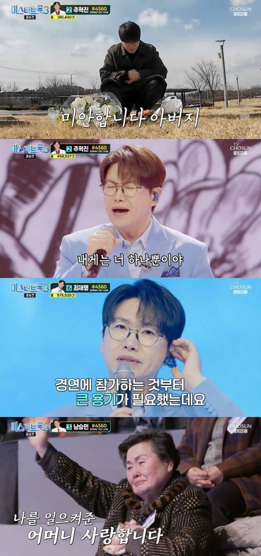 참다 울컥한 춘길은 “이 경연에 참가하는 것부터 큰 용기가 필요했는데요. 오래된 반짝 가수로서 뭔가 제 스스로 할 수 있는 게 없다고 생각하고 많은 걸 포기하고 살았었는데 저에게 용기가 되어주신 아들이 잘할까 어떨까 걱정하시면서 노심초사한 엄마께 사랑한다는 말씀, 감사의 말씀 드리겠다”라고 전해 감동을 자아냈다.