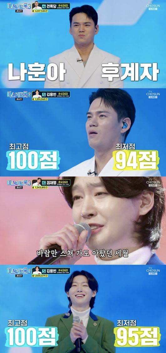 13일 방송된 TV CHOSUN 트로트 오디션 프로그램 ‘미스터트롯3’에서는 ‘인생곡 미션’으로 진행된 가운데 TOP7(손빈아, 최재명, 김용빈, 천록담, 남승민, 추혁진, 춘길)은 각자 인생에서 가장 의미 있는 노래를 선택해 ‘미스터트롯3’ 마지막 무대를 장식했다.