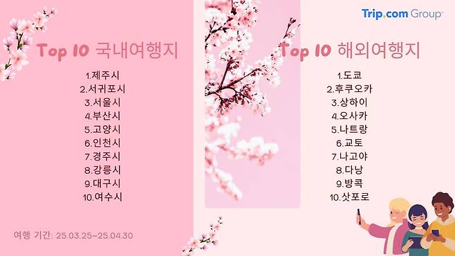 한편 트립닷컴 그룹에서 전 세계적으로 발표한 ‘봄철 여행 트렌드’는 “봄철 벚꽃 여행의 중심지는 여전히 일본이지만 많은 글로벌 여행객이 새로운 장소를 찾고 있으며 한국 역시 주목받는 나라 중 하나”라고 소개했다.