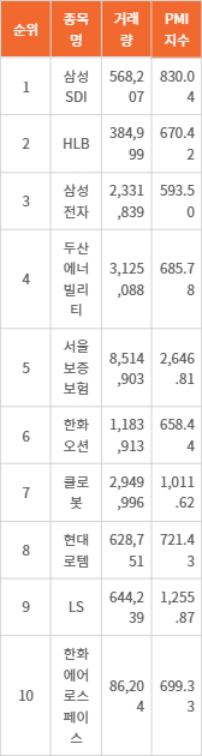 삼성SDI는 거래량 568,207주, PMI 지수 830.04포인트로 나타났다. HLB는 거래량 384,999주, PMI 지수 670.42포인트다. 삼성전자는 거래량 2,331,839주, PMI 지수 593.50포인트를 기록하고 있다. 두산에너빌리티는 거래량 3,125,088주, PMI 지수 685.78포인트다. 서울보증보험은 거래량 8,514,903주, PMI 지수 2,646.81포인트로 나타났다.