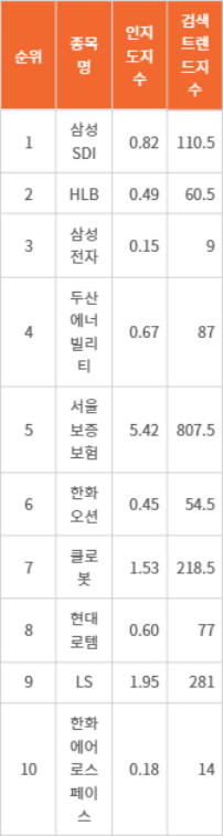 삼성SDI는 인지도 지수 0.82포인트, 검색 트렌드 지수 110.5포인트로 나타났다. HLB는 인지도 지수 0.49포인트, 검색 트렌드 지수 60.5포인트다. 삼성전자는 인지도 지수 0.15포인트, 검색 트렌드 지수 9포인트를 기록하고 있다. 두산에너빌리티는 인지도 지수 0.67포인트, 검색 트렌드 지수 87포인트다. 서울보증보험은 인지도 지수 5.42포인트, 검색 트렌드 지수 807.5포인트로 나타났다.