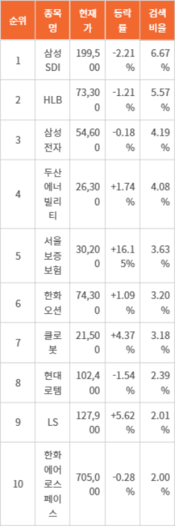14일 9시 30분 기준, 삼성SDI(006400)가 검색비율 6.67%로 실시간 포털에서 가장 많이 검색된 종목으로 나타났다. 삼성SDI의 현재가는 199,500원이며, 전 거래일 대비 2.21% 하락한 상태다. HLB(028300)는 73,300원으로 소폭 하락(1.21%) 중이며, 검색비율은 5.57%다. 삼성전자(005930)는 54,600원으로 보합세를 유지하며, 검색비율은 4.19%다. 두산에너빌리티(034020)는 26,300원으로 소폭 상승(1.74%) 중이고, 검색비율은 4.08%다. 서울보증보험(031210)은 30,200원으로 강한 상승(16.15%)세를 보이며, 검색비율은 3.63%다.