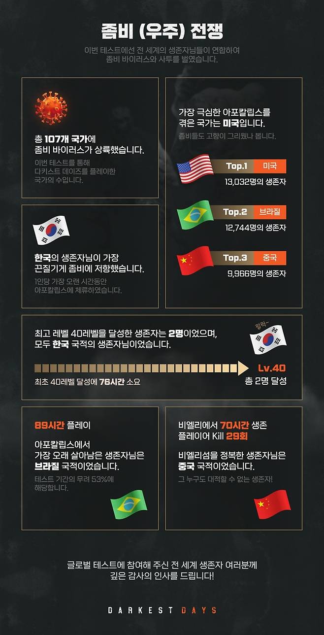 현재 '다키스트 데이즈'는 스팀에서 찜하기(위시리스트)로 등록한 이용자 수가 15만 명을 넘어섰다. 또한 '스팀 넥스트 페스트' 기간 동안 '떠오르는 출시 예정 게임 1위', '가장 많이 플레이한 체험판 게임' 상위권에 등극하며 OBT 출시 전 상승 곡선을 그렸다.