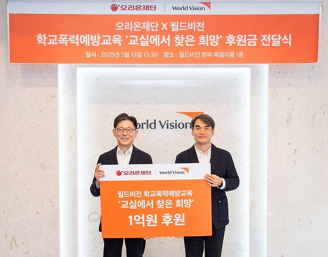 오리온그룹이 오리온재단을 통해 국제구호개발 NGO 월드비전의 '2025 교실에서 찾은 희망' 캠페인을 위한 후원금을 전달했다고 14일 밝혔다.
