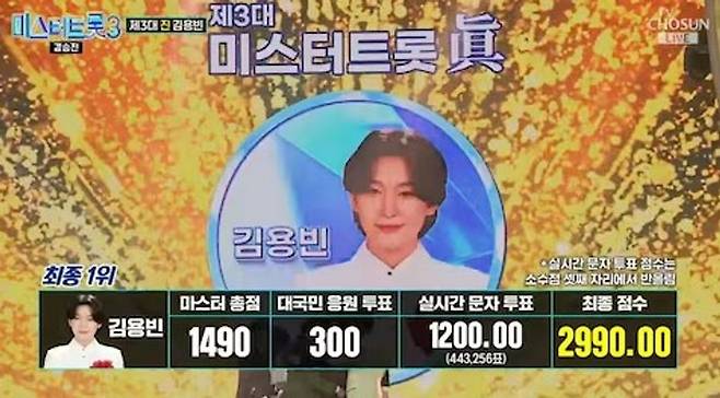 한편, '미스터트롯3' 최종 순위는 1위 김용빈, 2위 손빈아, 3위 천록담, 4위 춘길, 5위 최재명, 6위 남승민, 7위 추혁진 순이다. 다음 주는 TOP7이 출연하는 '미스터트롯3' 갈라쇼가 방송된다. 오는 29일부터는 서울 콘서트를 시작으로 전국 콘서트가 개최된다.