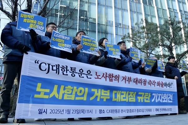 | ▲ 택배노조와 CJ 대한통운 대리점 연합이, 주 7일 배송과 관련하여 기본 협약을 도출했지만, 대리점 중에는 이 합의를 따르지 않겠다고 선언한 곳이 많아 지난 1월 23일 규탄 기자회견을 열었다. |
