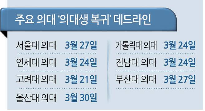 각 대학이 의대생 복귀 시한을 이달 말로 정한 것은 대학별 학칙 때문이다. 대부분의 의대는 학칙에 따라 출석 일수의 4분의 1 이상 수업을 듣지 않으면 F학점 처리된다. 출석 일수의 4분의 1에 해당하는 시한이 바로 이달 말이기에 데드라인으로 설정됐다.