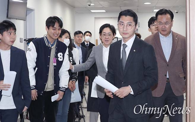 서울대 과잠바를 입은 서울대생들이 14일 오전 서울 여의도 국회 소통관에서 윤석열 대통령 탄핵 반대 기자회견을 하기 위해 들어서고 있다. 이날 회견을 주선한 국민의힘 박준태 의원(오른쪽 두 번째) 이외에도 조지연, 유상범, 박충권, 박성훈, 강선영 의원이 회견에 동석했다.