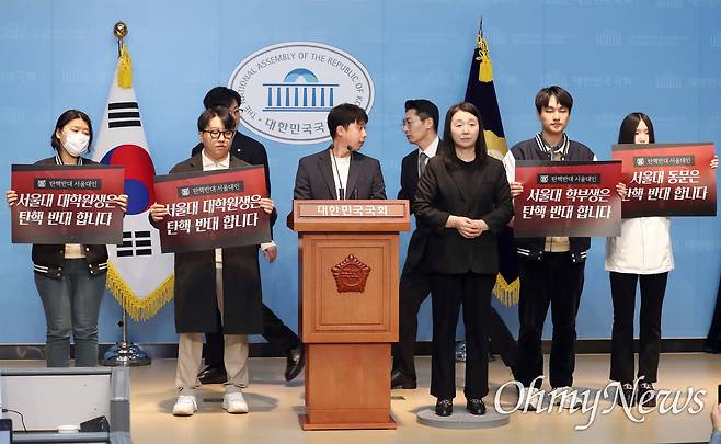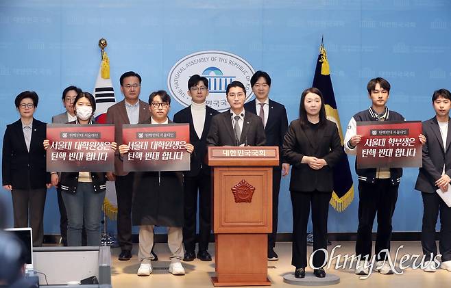 | ▲ '탄핵 반대' 서울대생 국회 회견 주선한 박준태 의원 서울대 과잠바를 입은 서울대생들이 14일 오전 서울 여의도 국회 소통관에서 윤석열 대통령 탄핵 반대 기자회견을 하고 있다. 이날 회견을 주선한 국민의힘 박준태 의원(가운데) 이외에도 조지연, 유상범, 박충권, 박성훈, 강선영 의원이 이날 회견에 동석했다. |