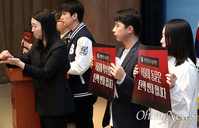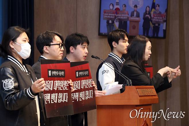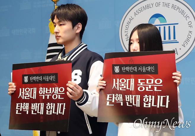 | ▲ 서울대 과잠바 입고 국회 온 서울대생 "탄핵 반대" 서울대 과잠바를 입은 서울대생들이 14일 오전 서울 여의도 국회 소통관에서 윤석열 대통령 탄핵 반대 기자회견을 하고 있다. |