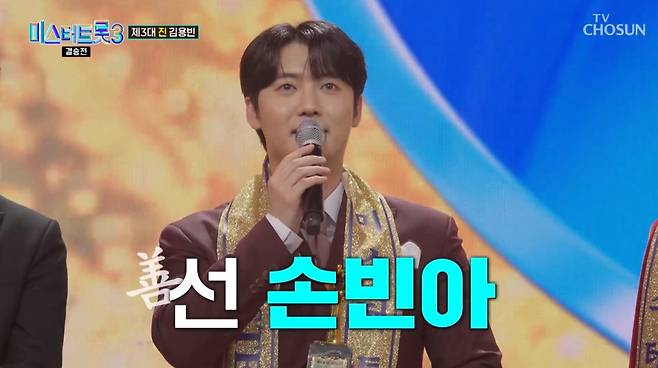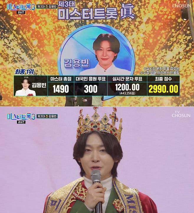 김성주 또한 "22년차 현역 가수 김용빈은 그동안 라운드에서 단 한번도 진의 자리에 오르지 못했는데 최종 결승에서 진에 오르며 왕관을 쓰게 됐다"고 설명했다.