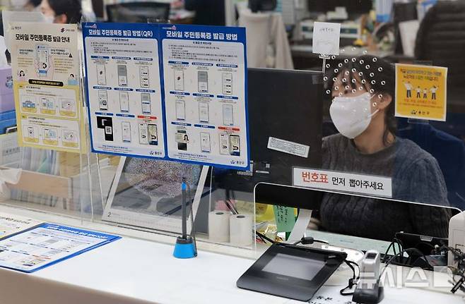 [서울=뉴시스] 고범준 기자 = 전국에서 모바일 주민등록증 발급이 시작된 14일 서울 용산구 남영동 주민센터에 모바일 주민등록증 발급 관련 안내문이 붙어 있다.