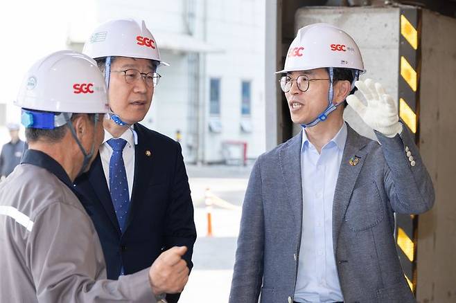 [서울=뉴시스] 김완섭 환경부 장관이 14일 전북 군산 에스지씨에너지를 방문해 탄소 포집·활용 설비를 살펴보고 온실가스 감축 선도기업에 대한 지원확대 방안을 논의하고 있다. (사진=환경부 제공) 2025.03.14. photo@newsis.com *재판매 및 DB 금지