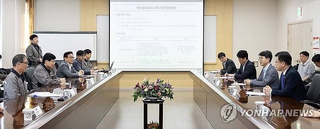 (서울=연합뉴스) 김완섭 환경부 장관이 14일 전북 군산시 에스지씨에너지 공장을 방문해 탄소중립설립 지원기업 관계자들과 간담회를 하고 있다. 2025.3.14 [환경부 제공. 재판매 및 DB 금지]