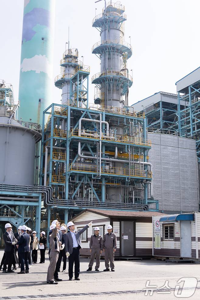 (서울=뉴스1) = 김완섭 환경부장관이 14일 전북 군산시 에스지씨에너지를 방문하여 탄소 포집·활용 설비를 살펴보고 온실가스 감축 선도기업에 대한 지원확대 방안을 논의하고 있다. (환경부 제공. 재판매 및 DB 금지) 2025.3.14/뉴스1