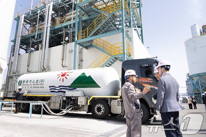 (서울=뉴스1) = 김완섭 환경부장관이 14일 전북 군산시 에스지씨에너지를 방문하여 탄소 포집·활용 설비를 살펴보고 온실가스 감축 선도기업에 대한 지원확대 방안을 논의하고 있다. (환경부 제공. 재판매 및 DB 금지) 2025.3.14/뉴스1
