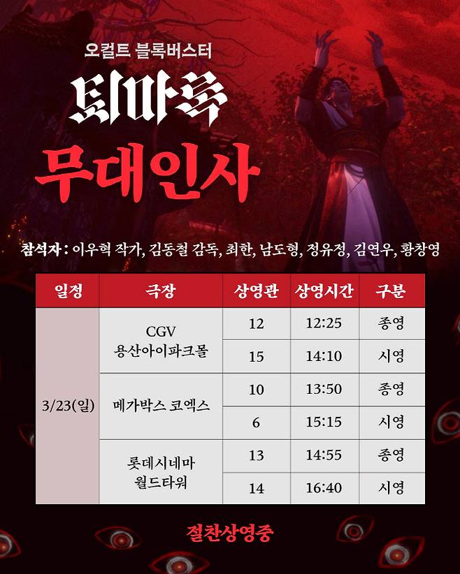 '퇴마록'이 최근 누적 40만 돌파를 기념하며 3월 23일(일) 퇴마사 4인과 서교주, 그리고 원작자 이우혁 작가과 김동철 감독이 함께하는 감사 무대인사를 전격 확정했다.