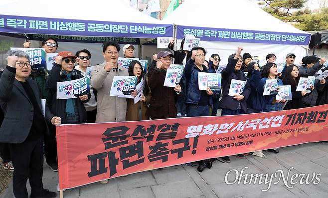 이명세, 백재호, 최하나, 정윤철, 남아름, 오세연, 김명준 영화 감독, 이준동 나우필름 대표와 영화인들이 14일 오전 서울 종로구 광화문 서십자각 '윤석열즉각퇴진·사회대개혁 비상행동' 단식농성장 앞에서 윤석열 대통령의 파면을 촉구하는 시국선언을 발표했다.
