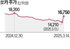 쏘카 주가는 지난해 3월 25일 2만2550원으로 52주 신고가를 기록한 뒤 꾸준히 우하향 곡선을 그려 이달 11일 장중 1만3550원까지 내려앉았다. 이날 공개매수 발표로 주가는 17.87% 오른 1만6750원에 거래를 마쳤다. 하지만 공개매수 규모가 너무 작아 주가 상승세가 이어질지는 미지수다.