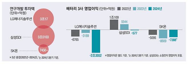 LG에너지솔루션 역시 연구개발 투자를 꾸준히 확대하며 지난해 1조882억원을 집행했다. SK온은 매년 수천억 원을 투자했다. 배터리 3사의 연구개발 투자 규모는 최근 3년간 7조원을 훌쩍 넘어섰다.