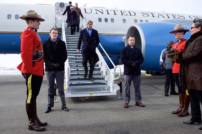 | ▲ 존 케리 미국 국무장관이 지난 2015년 4월 24일 캐나다 이칼루이트 국제공항에 전용기로 도착하고 있다. |