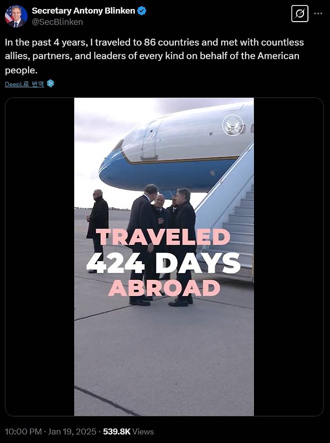 | ▲ 안토니 블링컨 전 미국 국무장관이 퇴임을 앞둔 지난 1월 19일 자신의 X 계정에 올린 4년간 외교 여정을 담은 영상 갈무리. 공항 활주로에 레드카펫이 깔린 장면보다 맨 바닥인 경우가 더 많다. |