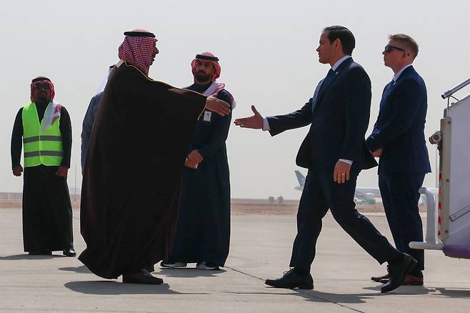 | ▲ 마코 루비오 미국 국무장관이 2월 17일 사우디아라비아 리야드 공항에 도착하고 있다. US Secretary of State Marco Rubio is received upon arrival at King Khalid International Airport in Riyadh on February 17, 2025. (Photo by Evelyn Hockstein / POOL / AFP) |