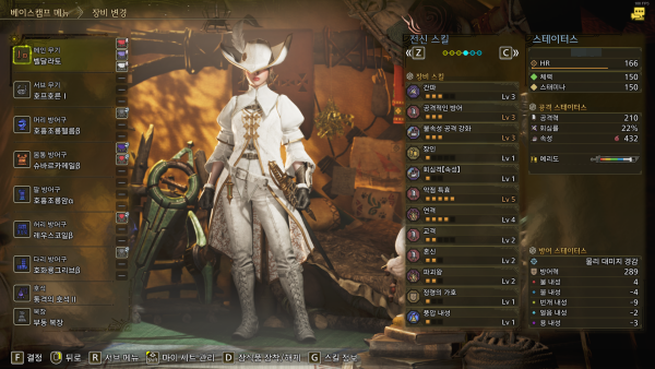 유틸 스킬은 활에게 필수인 체술 5레벨과 스태미나 급속 회복 3레벨을 채용했다. 추가적인 딜링 스킬로 연격을 추가해 공격력 및 속성치를 상승시키는 방향으로 세팅했다.