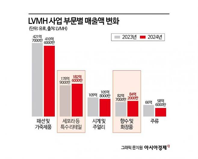 반면 비교적 저렴한 향수 및 화장품 카테고리의 매출은 성장세를 보였다. LVMH의 향수·화장품 부문 매출은 전년 대비 2% 증가했으며, 향수·코스메틱 뷰티 편집숍 세포라를 포함하는 특수 리테일 부문도 2% 성장했다. LVMH 측은 "세포라는 매출과 영업이익 모두 두 자릿수 성장했고, 특히 미국과 영국에서 강세를 보이고 있다"며 "향수·화장품 리테일러로서 입지를 강화하고 있다"고 평가했다.