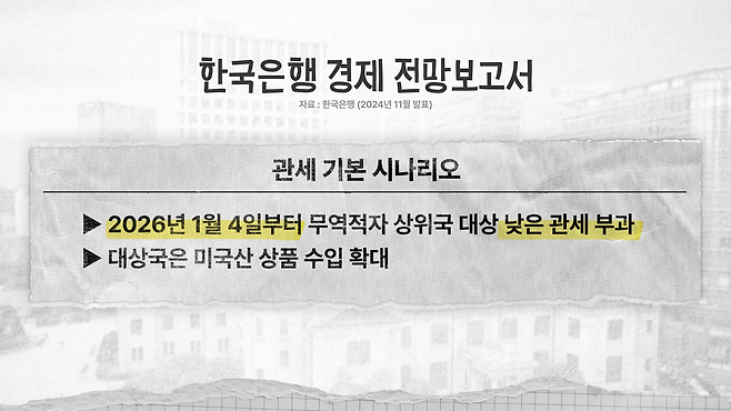 그런데 11월 한국은행의 경제 전망 때에 한국은행 전망 보고서의 맨 앞단에 있었던 가정과 전제가 저는 다소 좀 마음에 걸렸었는데, 이런 상황을 가정하고 전망을 하셨더라고요. 트럼프가 우리나라를 비롯한 많은 나라들에 보편 관세라고 해서 일방적으로 관세를 때리는 관세 전쟁을 벌이려고 하는데, 이러한 보편 관세 적용 시기가 2026년 1분기일 것이라고 가정하고 전제를 하셨더라고요. 당장 여기서 볼 수 있는 것처럼 지금 상황에서 보면 '아 그게 정말 실현될 수 있나?' '이미 관세 전쟁을 벌이고 있는 것 같은데?'라는 생각을 하게 되는 거죠.
