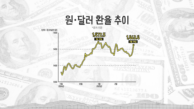 그러면 이 상황을 우리가 고금리 상황이 해소됐다고 볼 수가 있느냐? 저는 아닌 것 같아요. 그러면은 벌써 고물가, 고금리죠. 여기에 미국에서 트럼프 대통령이 되고 나서 자꾸 세상을 불안하게 만들고 주가가 빠질지도 모르겠고, 그러니까 이렇게 세상이 불안하고 불안정해지면 다들 어느 나라 통화를 찾죠? 미국 달러화를 찾잖아요. 그렇다 보니까 자꾸 미국 달러화의 가치는 올라가고, 그럼 제가 말씀드린 세 가지를 조합해 보면 고물가, 고금리, 강달러인 거죠.