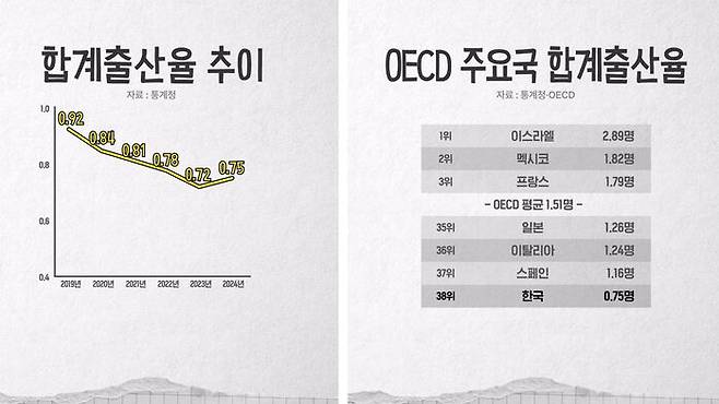 이미 있는 인구가 늙는 것도 그렇지만 새로운 인구도 중요한데 아이가 잘 안 태어나고 있잖아요. 다행스럽게도 최근에는 낮았던 출산율이 다소 반등하는 조짐을 보이고 있지만 여전히 0.7명대입니다. 이게 어느 정도냐면 OECD 국가라고 불리는, 우리가 이름을 들어봤을 법한 국가 중에서 합계출산율이라고 부르죠, 여성 1명이 평생 가임 기간 동안 낳을 것으로 예상되는 아이의 숫자가 출산율이거든요. 이게 1명 아래인 나라가 우리나라밖에 없어요.