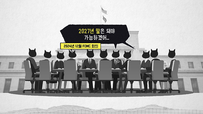 그리고 사실 앞서 말씀드린 내용은 2024년 12월 미국의 통화정책결정회의(FOMC)를 거치면서 더 강화된 걸로 보입니다. 3개월이 지나서 12월 미국 FOMC 이후에 발표된 미 연준 이사들을 대상으로 한 설문조사 결과를 보면, 9월에 2026년 말에 달성할 것으로 예상했던 2% 물가 상승률 목표 도달 시기를 1년 늦춰서 2027년 말이 될 걸로 응답했고요. 낮췄을 때의 저점에 해당하는 장기 적정 금리 수준이 2.9%였다가 3.0%로 도리어 더 올라갔다. 한마디로 금리를 더 낮출 생각이 없어졌고 금리를 빨리 낮출 생각이 더 없어졌다.