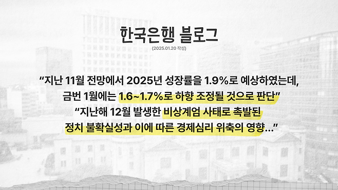 왜냐하면 한국은행은 원래 분기에 한 번씩 경제 전망을 발표하거든요. 지난해 11월에 전망을 발표했으니 정상적인 다음번 전망 발표 시기는 올해 2월입니다. 통화정책 결정 회의 끝나면서 동시에 나왔어야 돼요. 그런데 1월에 공식적인 경제 전망도 아니고 한국은행 블로그에 갑자기 글이 올라와서 '우리가 보니 한국 경제 성장률이 11월에 봤었던 1.9%가 아니라 1.6%나 1.7%밖에 안 될 것 같다. 그건 계엄과 탄핵 때문인 것 같다'라고 하셨거든요.