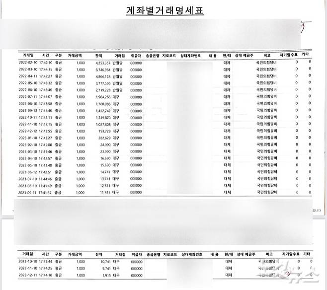 ◆ 송주열> 이게 대구 지역 탈퇴자가 제보를 한 건데요. 대구 지역 보시면 지금 뭐 거래점 대구로 찍혀 있죠. 당비를 납부한 겁니다, 매달. 보시면 2022년 2월 11일부터 쭉 납부를 하고 있잖아요. 1년 넘게 탈퇴하기 전까지 계속 납부했던 거죠. 이 당시에 당원 가입해라. 할 때부터 쭉 납부를 하고 있었다는 내용이고.