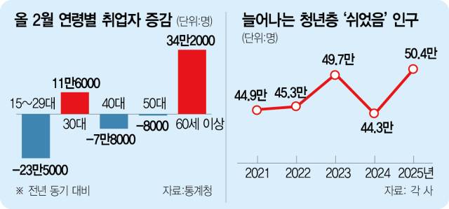 지난달 청년층의 취업자 수와 고용률은 4년여 만에 최저 수준으로 떨어졌다. 청년층 취업자는 355만 7000명으로 전년 동기 대비 23만 5000명 줄었다. 2022년 11월부터 28개월 연속 ‘마이너스’다. 감소 폭은 2021년 1월(31만 4000명) 이후 4년 1개월 만에 최대다.