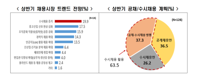 구체적으로는 ‘채용 계획 미정’이 41.3%로 전년동기 대비 3.9%포인트 늘었고, ‘채용 계획 없음’은 19.8%로 2.7%포인트 증가했다. 채용 계획이 있는 기업 중에서도 지난해보다 채용 규모를 줄이겠다고 응답한 기업은 28.6%로, 늘리겠다는 기업(12.2%)보다 두 배 이상 많았다. 채용 규모를 유지하겠다는 곳은 59.2%로 조사됐다. 1년 전보다 채용 축소 기업은 1.8%포인트 늘어난 반면 확대 기업은 3.9%포인트 줄었다.