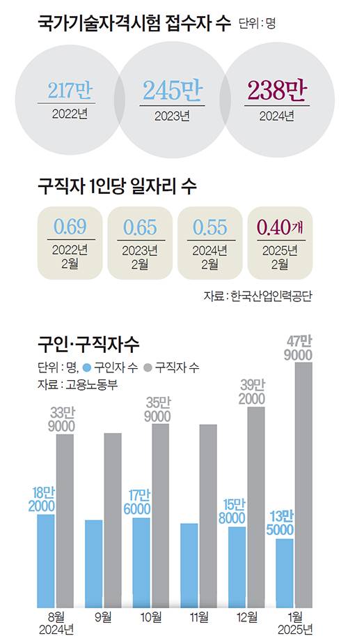 고용시장에 부는 찬바람도 블루칼라 직종에 대한 관심을 높이는 요인으로 작용하고 있다. 고용노동부가 운영하는 취업 정보 플랫폼인 ‘고용24’에 따르면 지난달 구직자 1인당 일자리 수는 0.40으로 글로벌 금융위기 때인 2009년 2월 이후 동월 기준 최저치를 기록했다. 지난 1월엔 0.28로 1999년 외환위기 때 수준(0.23)까지 떨어지기도 했다. 한상근 한국직업능력연구원 선임연구위원은 “구직자들이 과거에 비해 블루칼라 노동을 긍정적으로 바라보는 것은 주목할 만한 현상”이라면서도 “다만 양질의 일자리를 구하지 못한 차선책으로 여기는 시선이 여전히 남아 있는 것 또한 부인할 수 없다”고 진단했다.