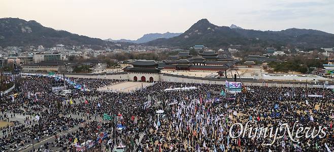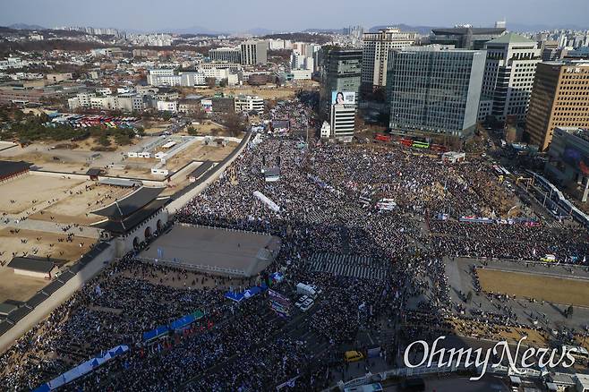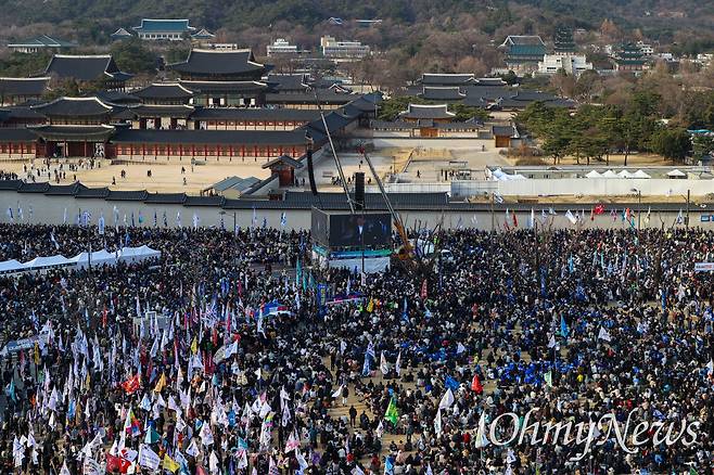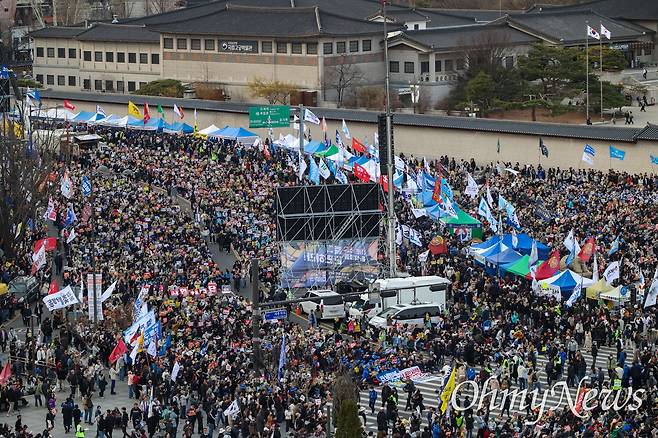 '100만 시민총집중의 날 - 윤석열 즉각퇴진! 사회대개혁! 15차 범시민대행진'이 15일 오후 서울 종로구 광화문 앞에서 야당과 윤석열퇴진비상행동 소속 단체 및 시민들이 참석한 가운데 열렸다(관련 기사: [오마이포토] 들끓는 헌재 앞 "내란세력 제압""극우국힘 규탄" https://omn.kr/2clj4 ).