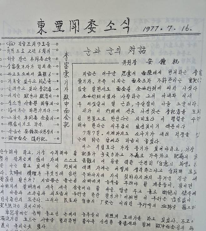 그날 만기 6개월을 앞둔 이부영을 먼빛으로 만나고 돌아온 안종필은 7월16일자 <동아투위소식>에 ‘눈과 눈의 대화’라는 제목으로 옥중면회기를 실었다.
