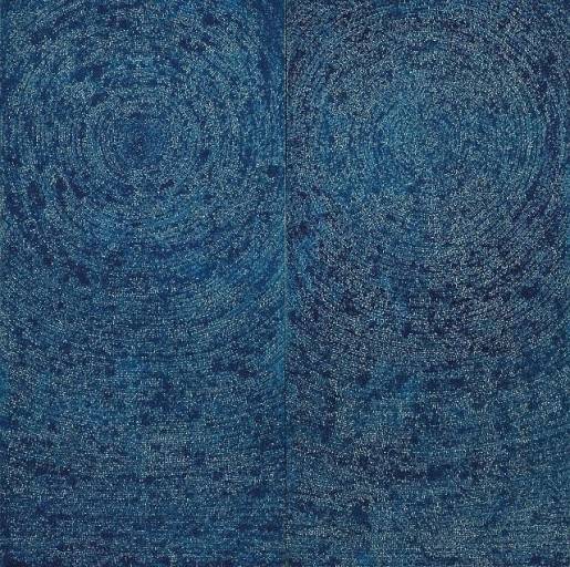 우주는 두폭화로 254*127 크기의 그림이 두 개가 붙어있는 작품이다. 이 그림을 보고 있자면 일단 크기에 압도되고 빙글빙글 돌아가는 두 개의 블랙홀에 빠져들 것 같은 느낌이 든다. 밤하늘의 무수한 별 같은 이 그림에 각각의 점이 의미하는 것은 무엇일까? 그의 작품엔 파란색이 많고 그의 파랑을 특정해 '환기블루'라고 하는데 왜 그는 유독 파란 색을 많이 썼을까?