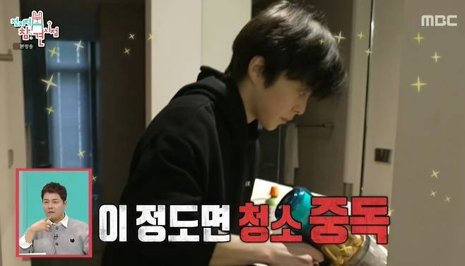 시우민은 "운동용 수건 따로 있냐"는 질문에 "운동용이다. 저건 저한텐 더러운 수건"이라고 했다. 시우민은 씻으러 가다 갑자기 먼지 청소를 하기도. 매니저는 "원래 깔끔한 성격이라 스케줄 끝나고 와도 청소하고 잔다"고 설명했다. 또 청소기를 들고 등장한 시우민을 보며 전현무는 "브라이언이 여기 가면 할 일이 없겠다"고 했다. 윤은혜가 "결혼하고 아내가 깔끔하지 않으면 어떡하냐"고 묻자 시우민은 "제가 해야죠"라고 답했다.