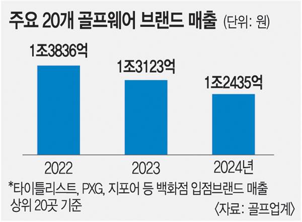 13일 업계에 따르면 주요 골프웨어 브랜드들은 매출 하락을 겪으며 사업 구조조정에 돌입했다. 크리스에프앤씨는 지난해 매출이 3313억원으로 전년 대비 10% 가까이 감소했으며 당기순이익 역시 적자로 전환됐다. 엘로드, 잭니클라우스, 왁 등 여러 골프 브랜드를 전개하는 코오롱FnC 역시 지난해 매출이 전년 대비 5% 감소한 1조2120억원을 기록했고, 영업이익은 64% 급감한 164억원에 그쳤다. 지난해 국내 골프웨어 상위 20개 브랜드의 총매출은 1조2435억원으로 전년 대비 6.3% 줄었다.