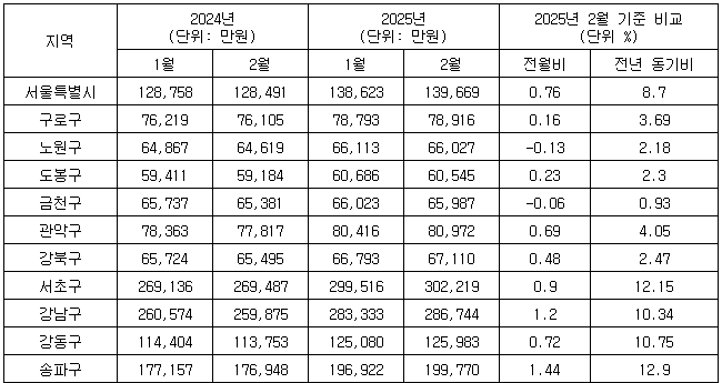 이어 강북(6억7천110만원) 0.48%, 도봉(6억545만원) 0.23%, 구로(7억8천916만원) 0.16% 각각 올랐다.