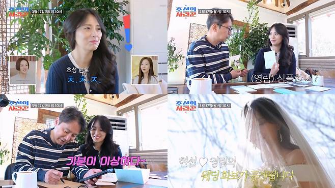 [스포츠조선 김소희 기자]TV CHOSUN 극사실주의 다큐 예능 '조선의 사랑꾼'에서 4월 결혼식을 앞두고 '연못남→예비신랑'으로 거듭난 심현섭이 예비 신부 정영림과 청첩장 디자인을 고른다.